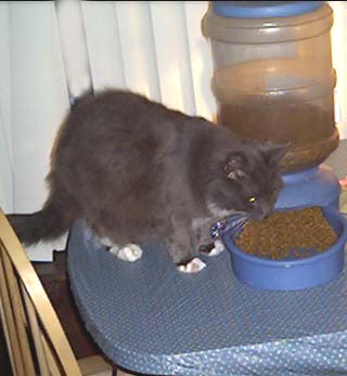 Toby likes to sit on top of the water dispenser. Otherwise, he's grey and snaggle-toothed.